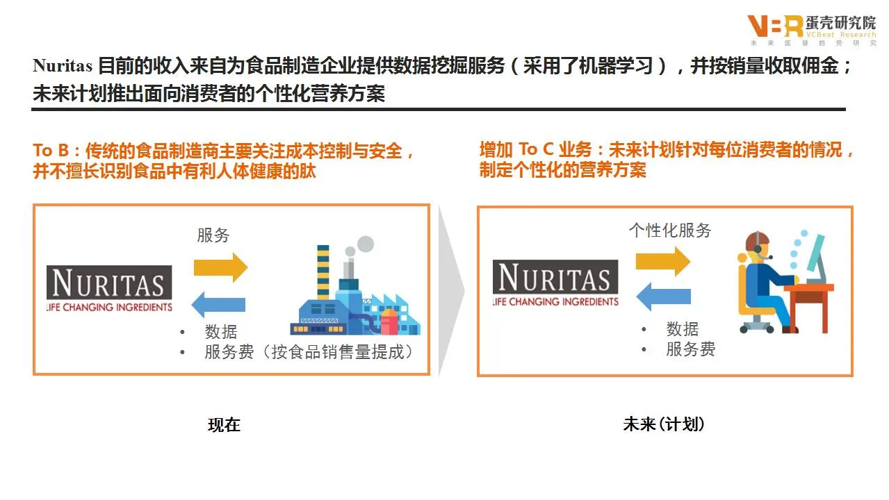 Nuritas 目前的收入来自B端。传统的食品制造商主要关注成本控制与安全,并不擅长识别食品中有利人体健康的肽。Nuritas为食品制造企业提供数据挖掘服务(采用了机器学习),并按销量收取佣金。未来计划推出面向消费者to C的个性化营养方案,针对每位消费者的情况制定不同的方案,收取服务费。