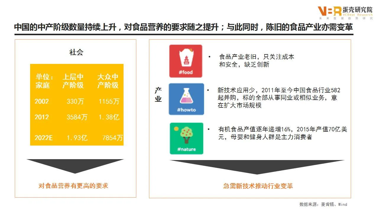 在我国,进入小康社会之后,人们的生活水平大幅度上升,上层中产阶级的数量从2002年的330万上升到2012年的3584万,大众中产阶级从1155万上升到1.38亿。这些人群对食品的营养有更高的要求,不仅仅是为了吃饱,而是为了身体健康能够吃好。合理的膳食搭配以及更安全的有机食品需求成为新的食品产业增长点,急需新技术推动行业变革。