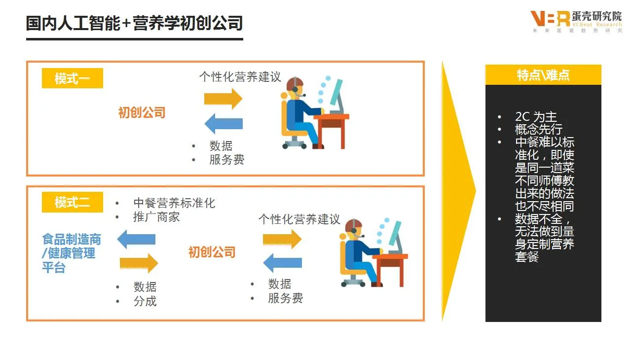 那么我们国内的人工智能+营养学初创公司应该如何为客户进行服务呢?我们建议有两种模式,主要针对C端用户。模式一是针对个人用户进行个性化营养建议,收取服务费。模式二是to C和to B同时服务,并推广中餐营养标准化。
