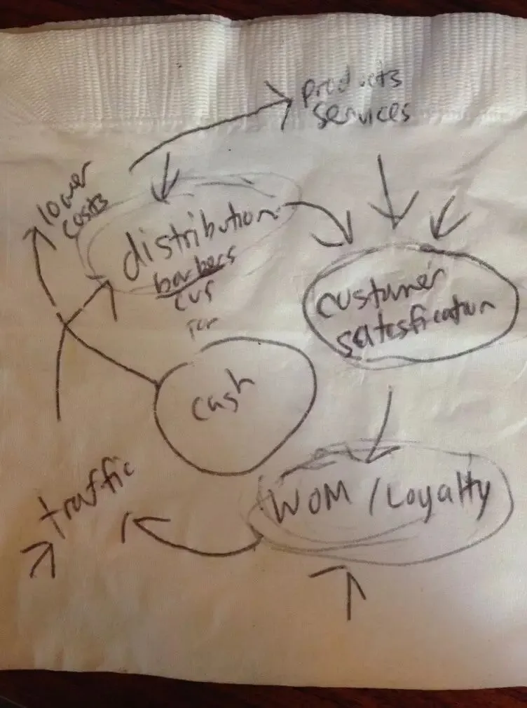 在成功的背后,鲜为人知的是,亚马逊的商业模式是贝索斯在一张餐巾纸上画出来的,贝索斯当年就用一块餐巾纸向投资者描述了创立亚马逊的计划,并成功地得到了宝贵的20万美元的种子投资。这个在餐巾纸上诞生的商业模式被世人称之为“亚马逊的飞轮”,其核心是丰富的选择、便利和低价,构成了亚马逊运营的三个支柱。在过去的十多年时间里,亚马逊依靠“飞轮模型”,发展成为一个市值1400亿的公司、全球最大的在线零售企业、市值仅次于谷歌的第二大互联网企业,缔造了一个庞大的在线商业帝国。