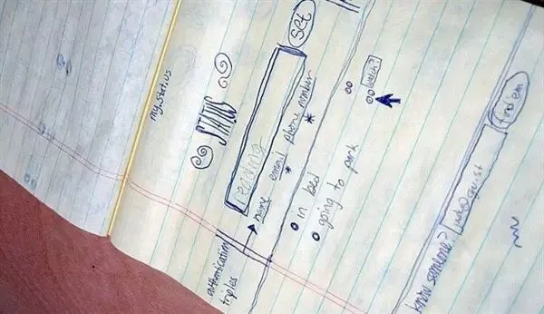 2006年,在另一个互联网商业领域,Twitter 的创始人Jack Dorsey (杰克·多西),硅谷明星创业者,低调的细节控,在画本上画出了他当时想象中 Twitter 的界面。他在 Flickr 上分享了这张草图,并描述它为“类似于能实时更新和分享状态的聊天通讯软件”。