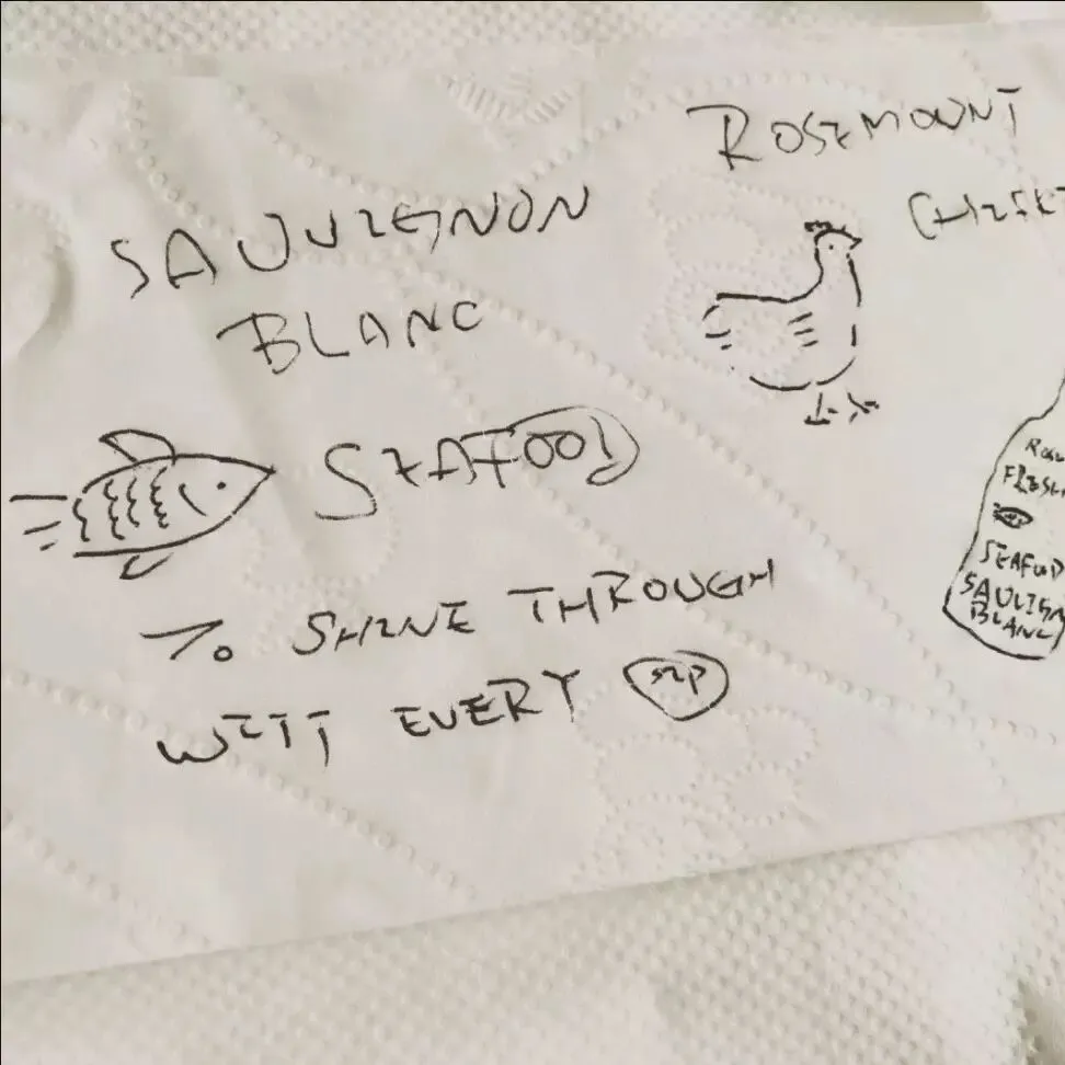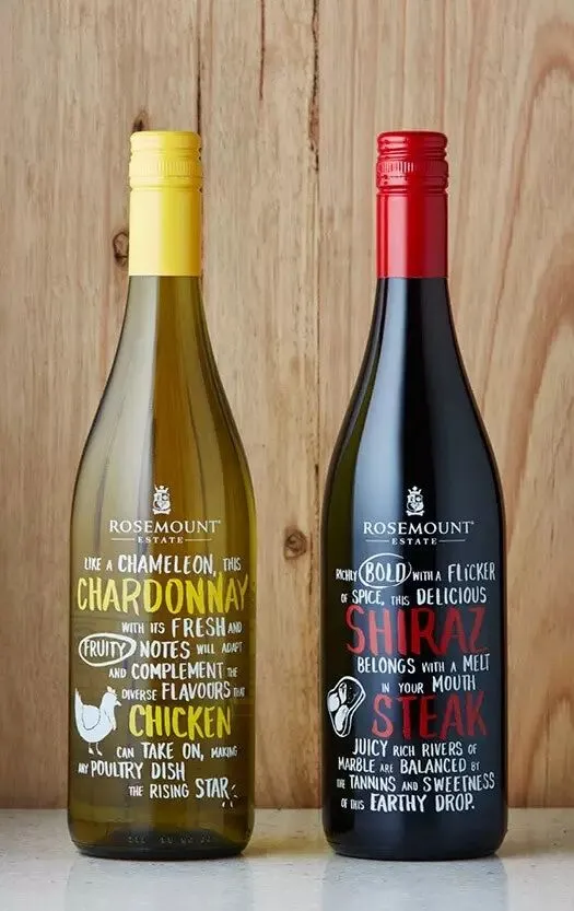 他们当即在一张餐巾纸上,用圆珠笔潦潦草草画了几笔示意图,随后即在该集团旗下的核心品牌若诗庄园(Rosemount Estate)在全球市场推出了针对餐酒搭配的葡萄酒产品——配餐系列(Meal Matcher)。独一无二的时尚外观,简洁明了的在瓶身上画出最适合搭配的食材指引,让选酒变得简单而富有乐趣。该系列包括长相思、霞多丽、西拉和一款赤霞珠梅洛混酿,分别针对海鲜、牛肉、猪肉、禽类和面食等食材。该系列葡萄酒拥有易饮,口感丰腴、果味丰富等特点,搭配各式各样的中西美食都游刃有余。