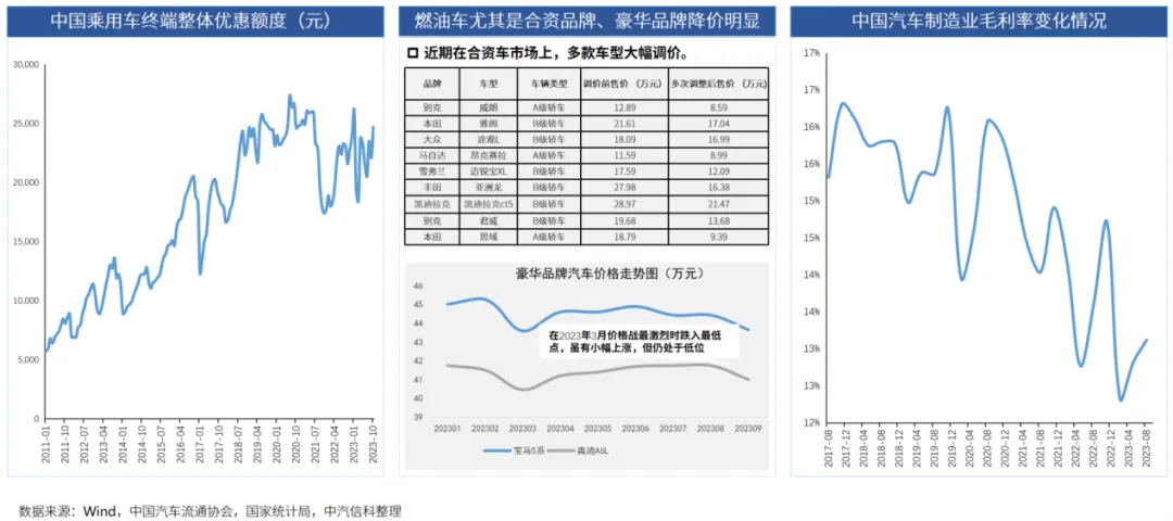 2023年,价格战持续升级,乘用车整体优惠幅度处于较高水平;全部车型在2023年均出现大幅降低,尤其是豪车品牌;汽车制造企业毛利率持续走低。