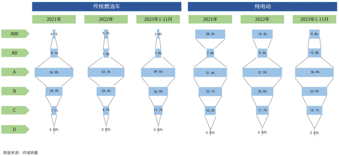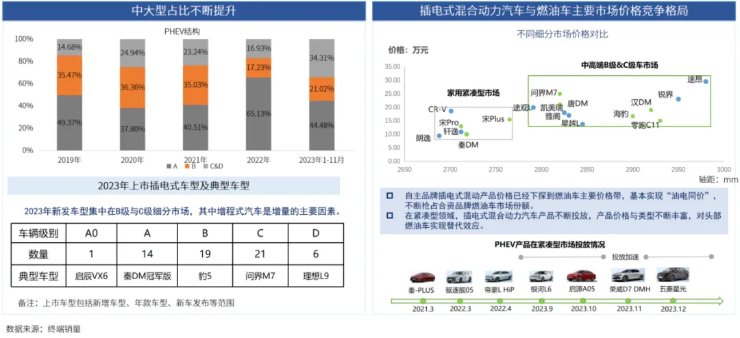 在行业供大于需的情况并没有明显缓解、动力电池原材料价格不断降低等的影响下,预计价格战还将持续一段时间,并对产品结构产生深度影响。纯电动方面,车型逐渐由“两头挤”向“纺锤形”转变,产品结构与燃油车趋同,A级的紧凑型市场将成为纯电动的主攻市场;插电式方面,大型化、油电同价趋势明显。