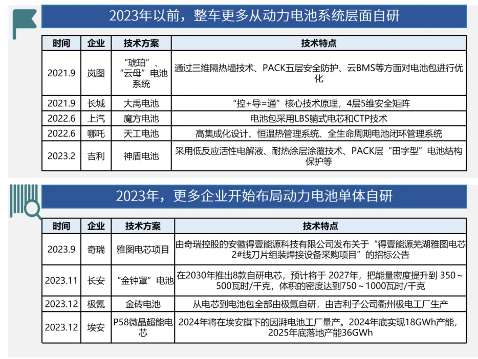 为了更好的控制成本、掌握核心技术,2023年以奇瑞、长安、极氪、广汽等为代表的整车企业对于动力电池的自研逐渐由电池系统转为电池单体。但短期内,动力电池全栈自研需要投入更多人力和财力等,因此大多数企业短期内仍以外购为主。