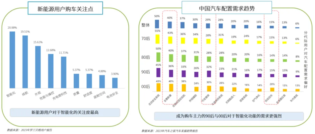 随着用户群体的年轻化趋势,消费者购买行为也在发生转变。原购车决策中的价格、安全性等对消费者的影响力减弱,而汽车智能化配置、功能体验等重要性不断攀升。尤其是对于未来购车主力的90后和00后,智能化配置与功能的吸引力更大。