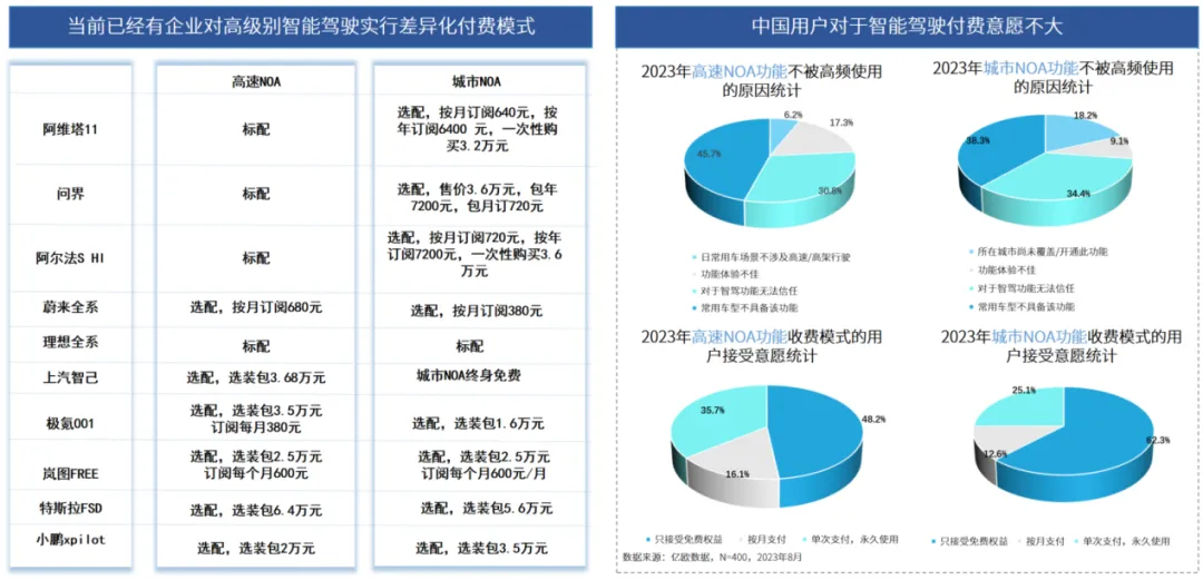 目前除理想等企业外,绝大部分整车企业均对高级别自动驾驶实行差异化的付费模式,但从中国用户的驾驶与消费行为来看,短期内,用户对于高级别自动驾驶的付费意愿仍不大,很难形成整车企业的固定收入来源。