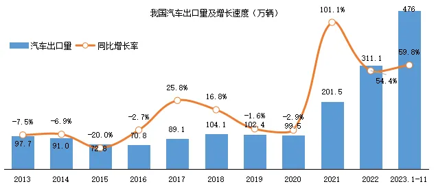 2023年我国汽车市场登顶全球最大汽车出口国已成定局。我国2023年1-11月累计出口汽车476万辆,同比增长59.8%,汽车出口总量保持高增长态势。随着我国汽车智能化、电动化技术深入发展,自主品牌国际影响力持续提升,汽车出口将延续高增长态势,预计2023年汽车出口将超过500万辆,2024年将达550万辆规模。我国完整的汽车产业链可以为汽车出口提供强劲动力,不过国际环境复杂多变,逆全球化蔓延等,我国汽车出口仍面临巨大挑战。
