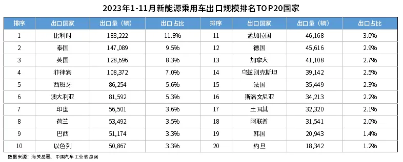 纯电、混动、动力电池等新能源汽车技术相继突破,并形成全球极具竞争力的新能源汽车产业链、供应链体系,在技术优势、产业链优势、价格优势、创新商业模式支撑下,助力我国新能源汽车产品逐渐赢得海外市场认可。根据海关数据,2023年1-11月,我国新能源汽车出口量约159.53万辆,占汽车出口总量的33.8%,高于国内新能源汽车渗透率的30.8%,新能源汽车出口成为助推我国汽车出口持续增长的主力军。从出口价格来看,新能源汽车出口均价约2.37万美元,高于汽车出口均价的2.00万美元。从出口国别来看,我国约40%新能源汽车出口面向欧盟市场,特别是英国、西班牙、荷兰等碳排放法规严苛的欧洲国家成为我国新能源汽车出口的主要市场,促使我国汽车工业与国际主流车企同台竞争,巩固汽车出口全球第一的国际地位。