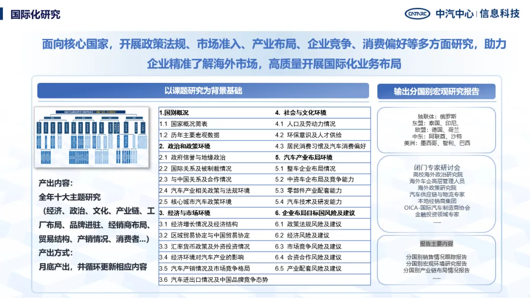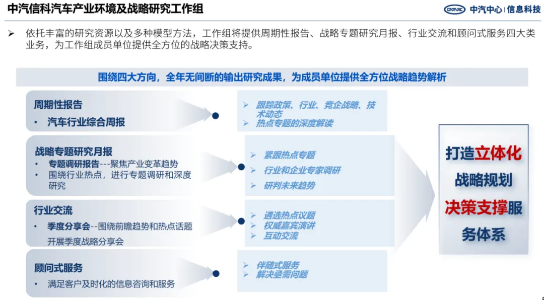 中汽信科战略研究工作组致力于对汽车产业外部环境进行洞察,研究领域包括政策、市场、产品、技术等方面,主要面向企业的战略相关部门,提供周期性报告、战略研讨会、顾问式服务及报告全文检索系统等内容,搭建汽车行业战略规划的“朋友圈”,解决企业常态化的、临时性、突发性对汽车产业外部环境监测的需求。