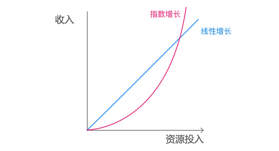 资源投入(除了服务交付的直接成本外,还包括研发、营销等间接资源投入)和营业收入的关系是线性增长还是指数增长:前者是“一分投入、一分收获”,后者是基础投入大,产出低,但是到了一定投入临界线、或者经历一段时间后,收入增速会超过资源投入的增速;或者说线性增长的边际毛利是固定的,而指数增长的边际毛利是递增的: