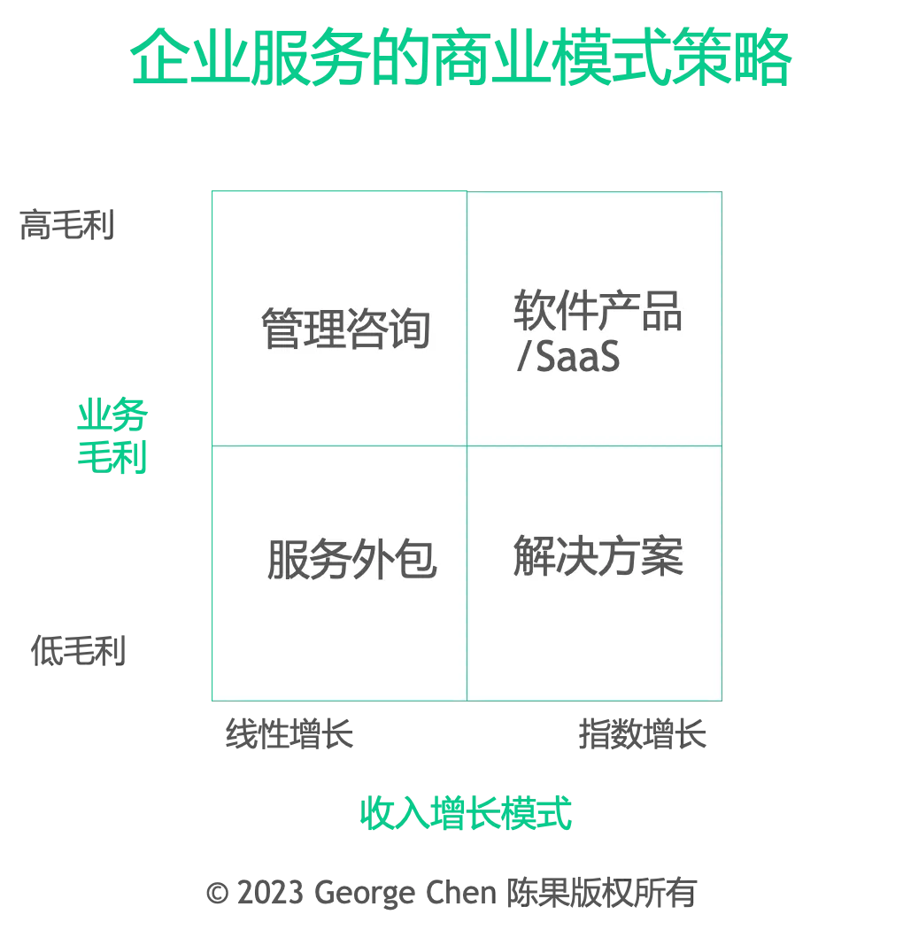 低毛利/指数增长:解决方案类业务,例如财务共享、智能汽车等行业方案开发或实施,半标准化的解决方案结合定制化服务来创造客户价值,这种业务有一定的产品特性,随着方案成熟度提升,方案可重用度高,边际毛利会增长;但是解决方案服务的可替代性高,对企业来说,其业务性质属于复杂服务的外包,所以难以保证高毛利水平;
