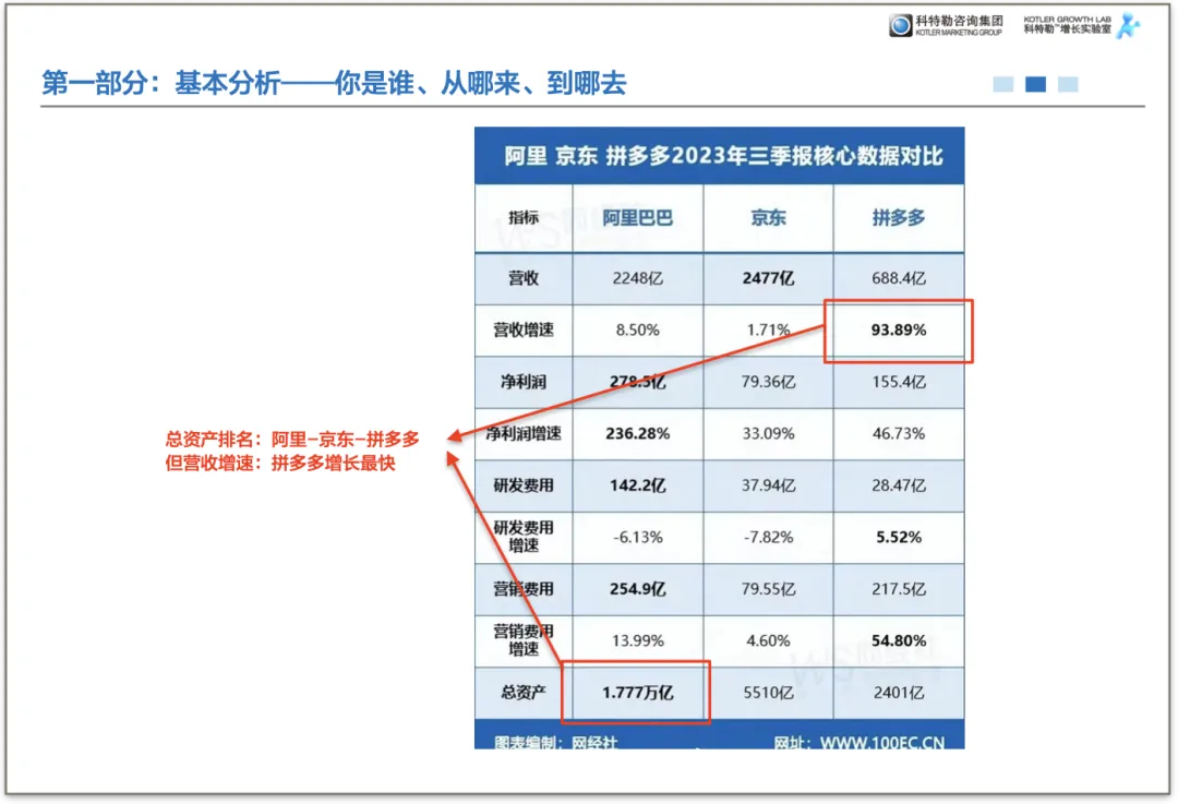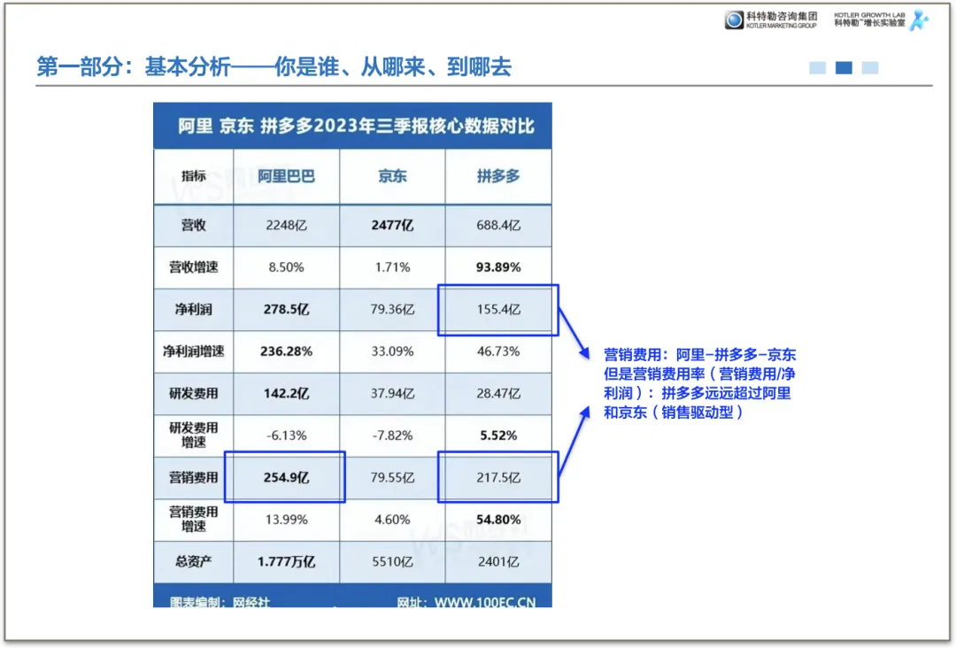 我们再看刚才电商行业的数据。我们发现营销费用最高的是阿里,其次是拼多多,京东的营销费用很少。这是否意味着阿里就是营销驱动,京东就是产品驱动?不是,要看比例,对比营销费用和净利润,一对比我们会发现:拼多多这个比例非常高,阿里和京东的比例几乎一致。所以拼多多是极度依赖销售拉动增长的。