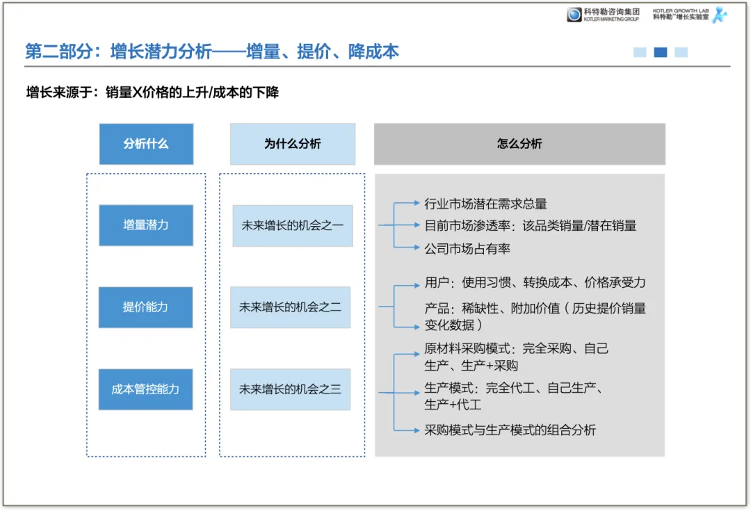 增长一般来源于:销量X价格的上升/成本的下降。注意:本次不考虑多元业务扩张和品牌、数字化等技术因素,只就目前的产品和管理水平而言。