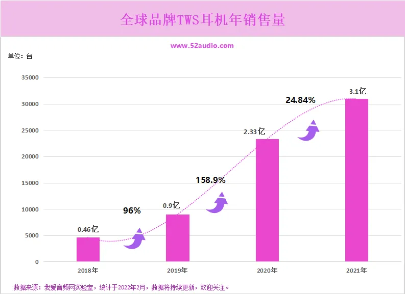 2021年,全球TWS耳机销售量为:3.1亿台;