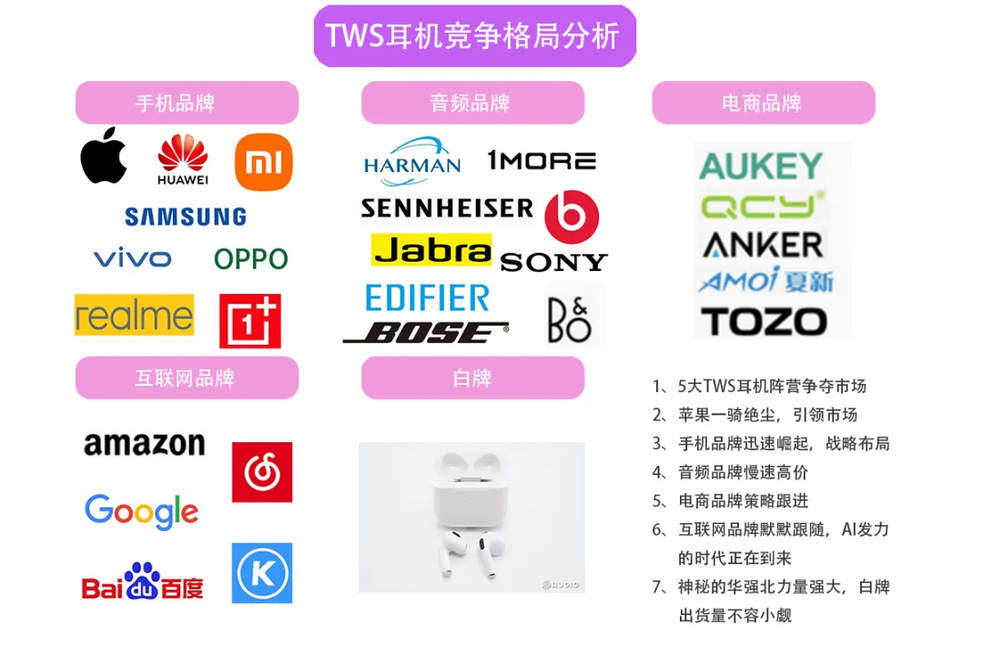 在TWS耳机市场上活跃的,除了这些知名品牌之外,白牌TWS耳机也占据相当大一部分市场份额,在这几年间,市场上不断出现很多优质的白牌TWS耳机产品,以华强北市场的苹果三代TWS耳机为例,均能够紧跟市场的技术迭代升级,甚至还推出了具有空间音频效果的TWS耳机产品,这些市场动向均说明市场上消费者对于TWS耳机的使用需求仍然存在。
