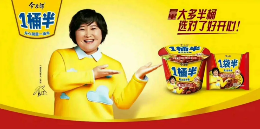 3.强化主品牌认知。今麦郎通过三大视觉符号:logo、贾玲、一桶半,打造大而强的今麦郎主品牌认知。