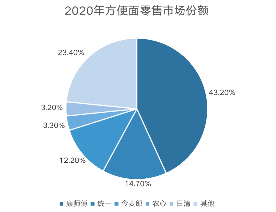 今麦郎国民化战略的成功。2019年,今麦郎整体营收达到218.49亿,是其创建以来第一次营收过两百亿(根据公开资料整理)。2020年,旗下“凉白开”和“一桶半”系列销售量不俗,前者超过24亿瓶,后者累计销量超过50亿桶。一举打破康师傅和统一在城区市场的垄断局面从两大巨头手中抢下30%的市场份额。如今,康师傅、统一、今麦郎三大品牌占据方便面大半壁江山,可以说三足鼎立。