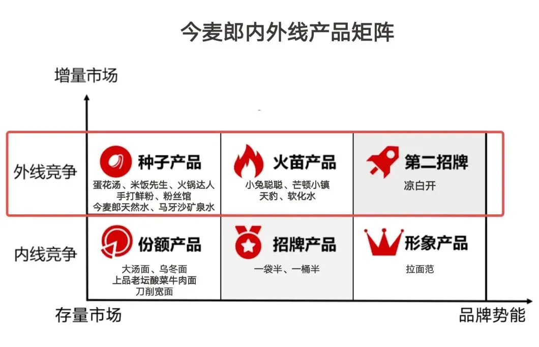 外线竞争是品牌为提升势能、应对竞争而进入的一个新品类,同时让品牌创造增量的市场。种子产品、火苗产品和第二招牌都属于外线产品。
