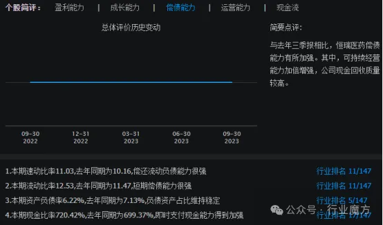与2022年3季报相比,2023年3季报,恒瑞医药偿债能力有所加强。其中,可持续经营能力加倍增强,公司现金回收质量较高。