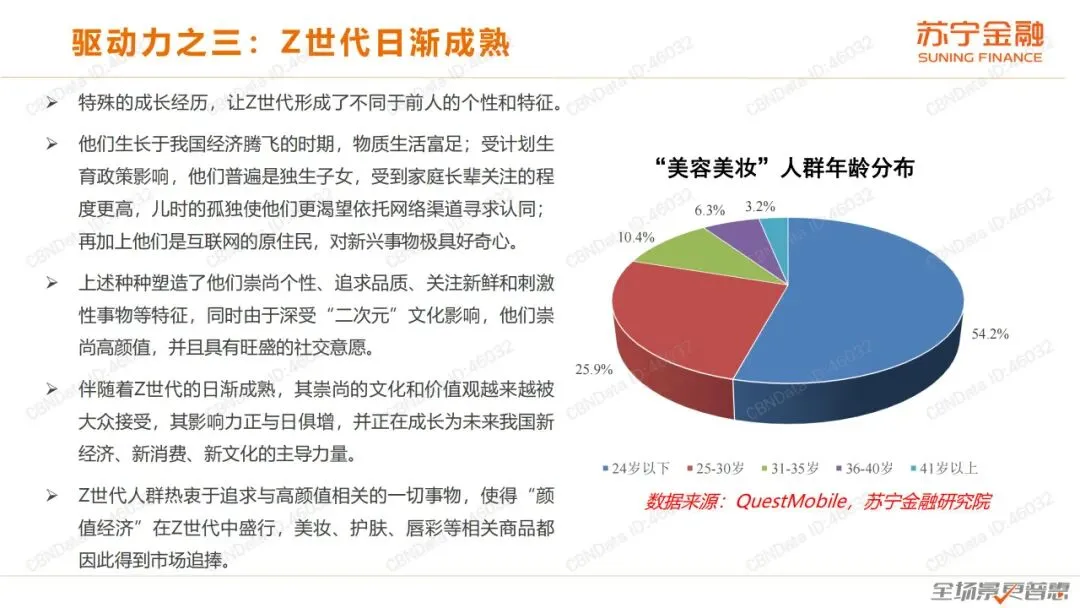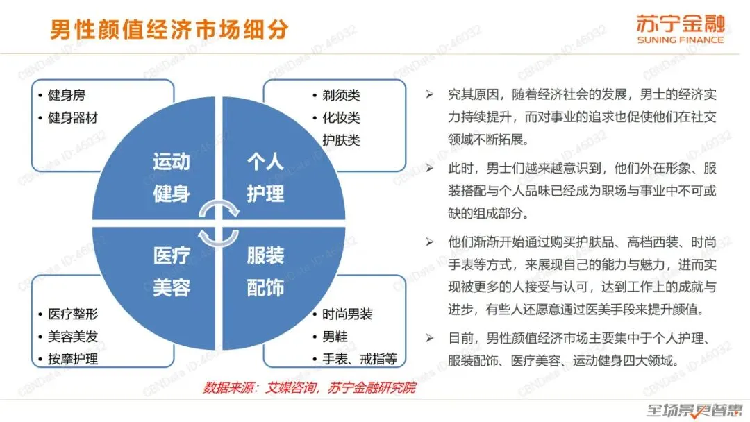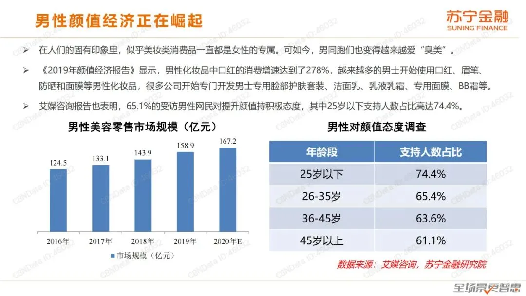 在人们的固有印象里,似乎美妆类消费品一直都是女性的专属,可如今,男同胞们也变得越来越爱“臭美”,这也意味着未来颜值经济消费市场的增长空间将不可限量。因此,我们迫切需要看懂颜值经济背后的逻辑和机遇,苏宁金融研究院发布《颜值经济研究报告》(下简称《报告》),旨在对颜值经济各方面特征进行剖析,并对其中的演变逻辑、行业前景以及投资机会进行预判。