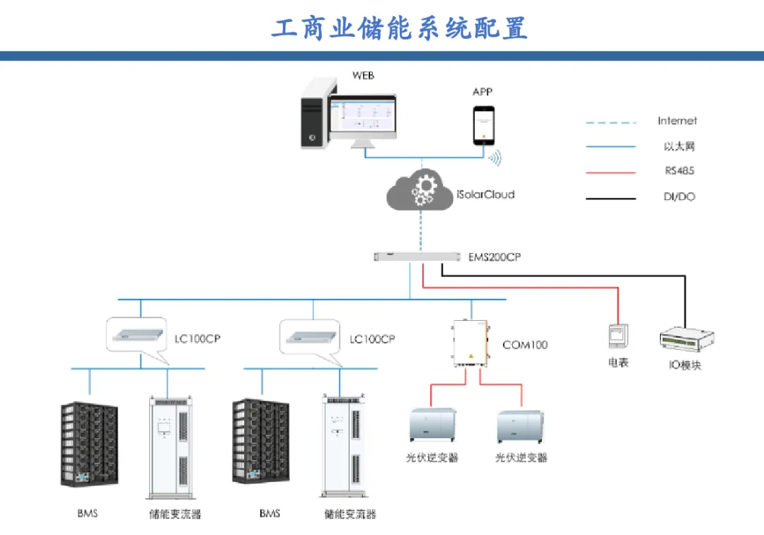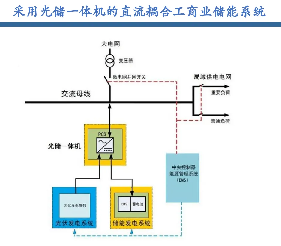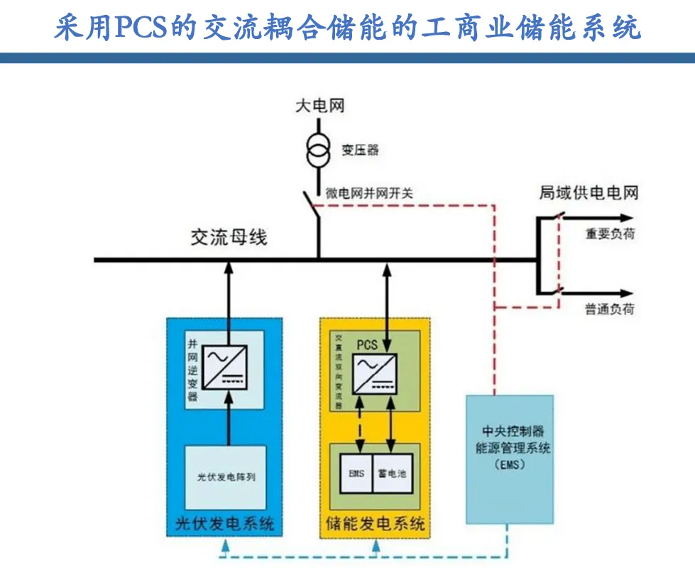 储能系统在用户侧的典型应用。根据终端客户来分,储能行业主要针对发电侧、电网侧和用户侧,其中用户侧储能可分为户用储能和工商业储能。工商业用户配置储能的主要原因是满足自身内部用电需求,利用峰谷电价差套利降低运营成本,储能也可作为备用电源以应对突发停电事故;若配置光伏,还可实现光伏发电最大化自发自用,有效提升清洁能源的消纳率。工商业储能系统为模块化设计,电压容量灵活配置。工商业储能系统主要包括电池和电池管理系统(BMS)、变流器(PCS)、能量管理系统(EMS)及其他电气化部件。电站架构可分为交流耦合与光储一体机。采用PCS的交流耦合储能的工商业储能系统配置与储能电站基本一致,PCS逆变器大多以双向变流为主,在中小工商业储能系统中也开始用50-100kW的光储一体机。对比来看,交流耦合储能成本较高,但灵活性更好,如在已经安装的光伏系统中加装储能系统,只需加装蓄电池和双向变流器,不影响原光伏系统;直流耦合方案成本更低,适合白天负载较少而晚上较多的用户。