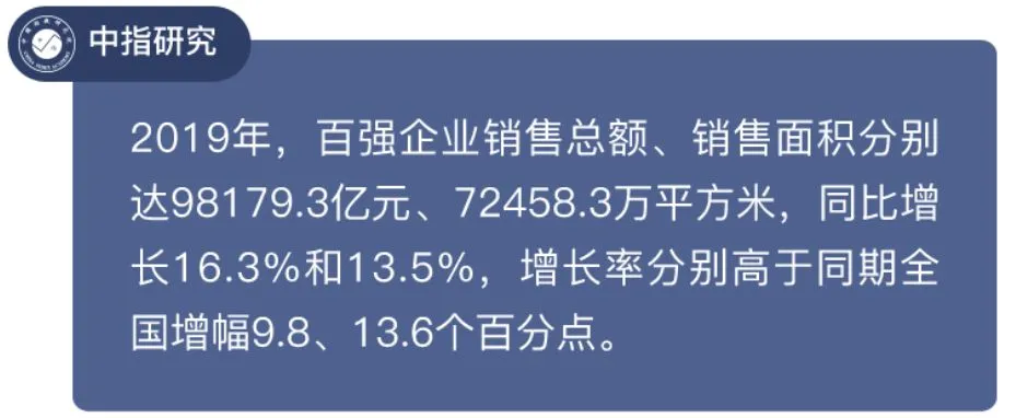 2019年,中国房地产市场调控政策持续,全国新建商品房成交规模增速有所回落,百强企业销售规模近十万亿,市场份额进一步提升。百强企业紧抓城市群及热点城市发展机遇,把握市场主流需求、打造适销对路的产品,不断加大营销力度助力规模的增长。与此同时,百强企业更加注重品质与管理、科学决策精准投资,防范经营风险,同时回归产品本源,朝着高质量发展阶段迈进。