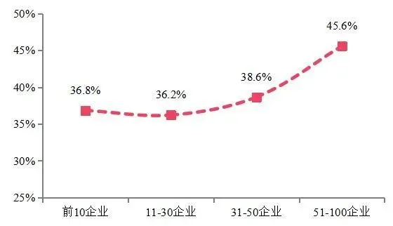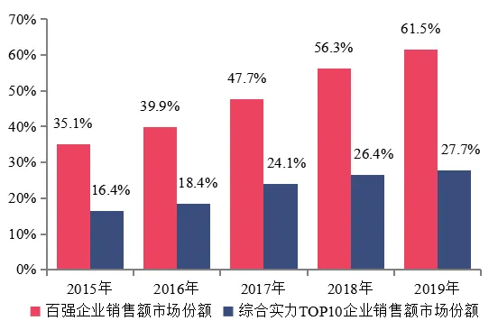 百强企业市场份额持续扩大,持续扩大至六成,行业集中度进一步提升。2019年,百强企业销售额市场份额稳步上升至61.5%,较上年提高5.2个百分点,综合实力TOP10企业销售额市场份额为27.7%,较上年提高1.3个百分点。