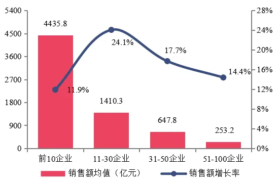 百强企业不同阵营2019年销售额及其增长率均值情况