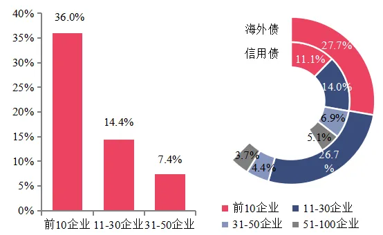 百强企业地级以上城市覆盖率及信用债、海外债融资占比