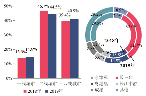 百强代表企业2018、2019年各等级城市销售额分布