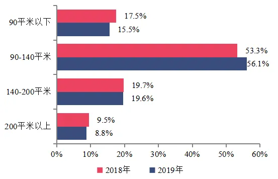 2019年,百强企业加大首改类产品的推出比例,支撑企业销售业绩的稳步增长。从50家百强代表企业重点项目各面积段产品的销售额占比来看:90-140平米首改类产品销售额占比达56.1%,较上年提升2.8个百分点。