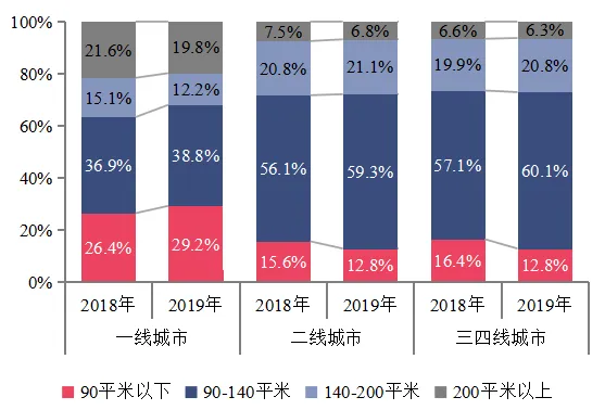 50家代表企业2018、2019年分城市等级各面积段销售占比