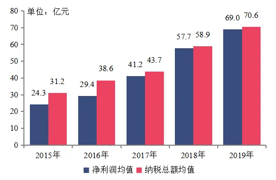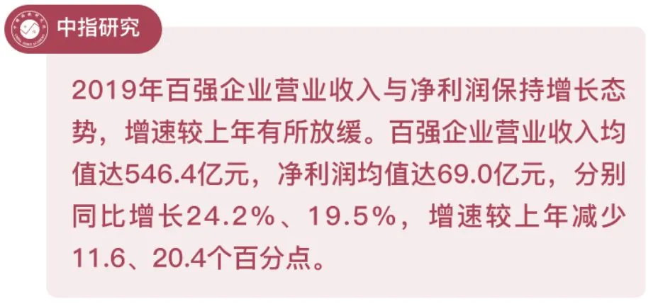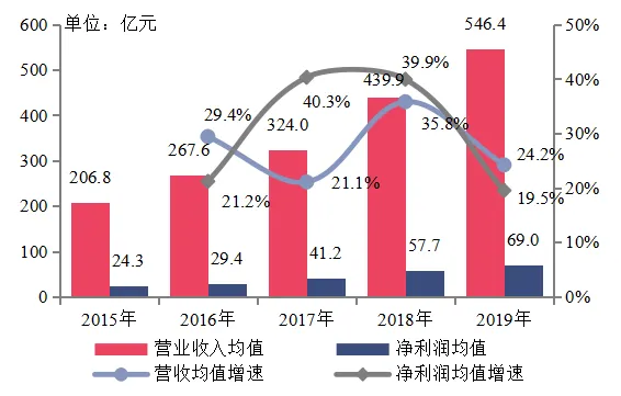 百强企业2015-2019年营业收入与净利润均值变化情况