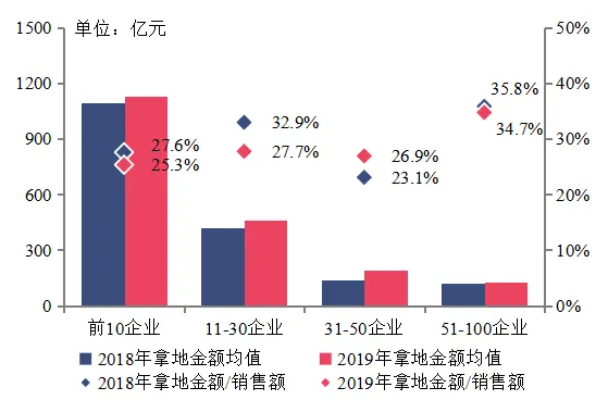 百强代表企业2018-2019年拿地金额占销售额比重均值