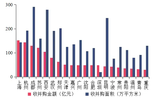 百强代表企业2019年收并购金额前20城市