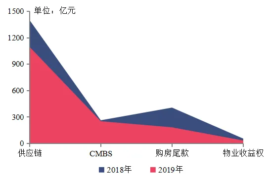 百强企业积极通过资产证券化盘活资金,ABS发行规模占房地产企业发行总量的62.4%。2019年,百强企业的ABS发行规模同比增长13.4%,共计1797.3亿元。供应链ABS是百强企业发行ABS的主要类型,发行量1094.0亿元,占比达60.9%。