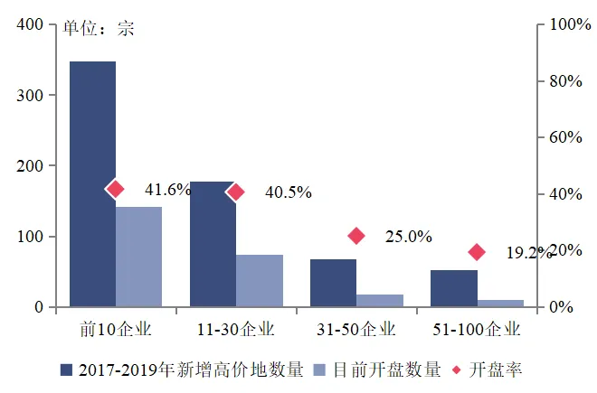 各层级百强企业2017-2019年新增高价地开盘情况