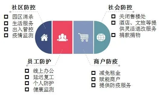 2020年,面对新冠肺炎疫情,百强企业积极捐款捐物,部分企业参与防疫设施建设工作。同时,百强企业严防控筑牢防疫战线,通过及时关闭售楼处、加强防疫宣传工作等,守护好防疫工作大后方。此外,百强企业为租户减免租金,帮助小微企业度过难关。