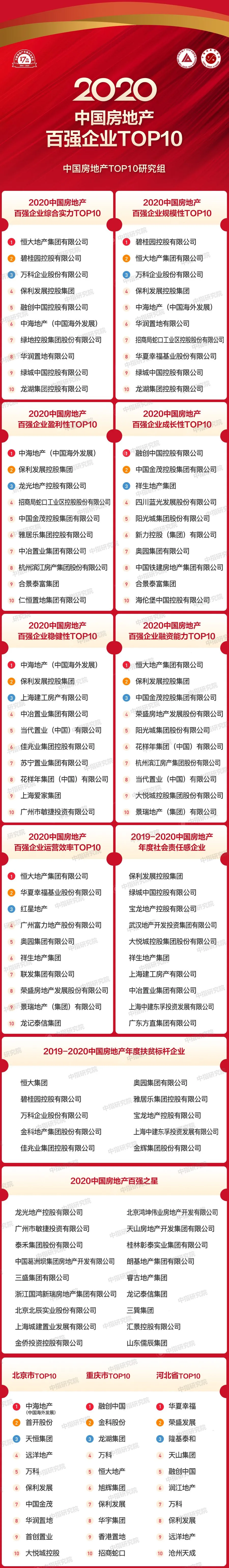 2020年新年伊始,突如其来的新冠病毒给社会经济带来巨大影响。房地产百强企业在全力抗击疫情的同时,积极恢复投资生产,为行业及经济平稳发展做出贡献。中国房地产TOP10研究组紧随行业发展脉搏,连续十七年深入研究房地产企业经营规律,为促进行业良性运行、企业快速成长发挥了重要作用,相关研究成果已成为评判房地产企业经营实力及行业地位的重要依据。