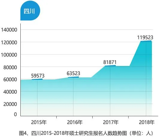2018年,四川省研究生招生考试报名人数再度飙升,有效报名人数达到了119523人,较2017年增加了37583人,增幅为45.87%。