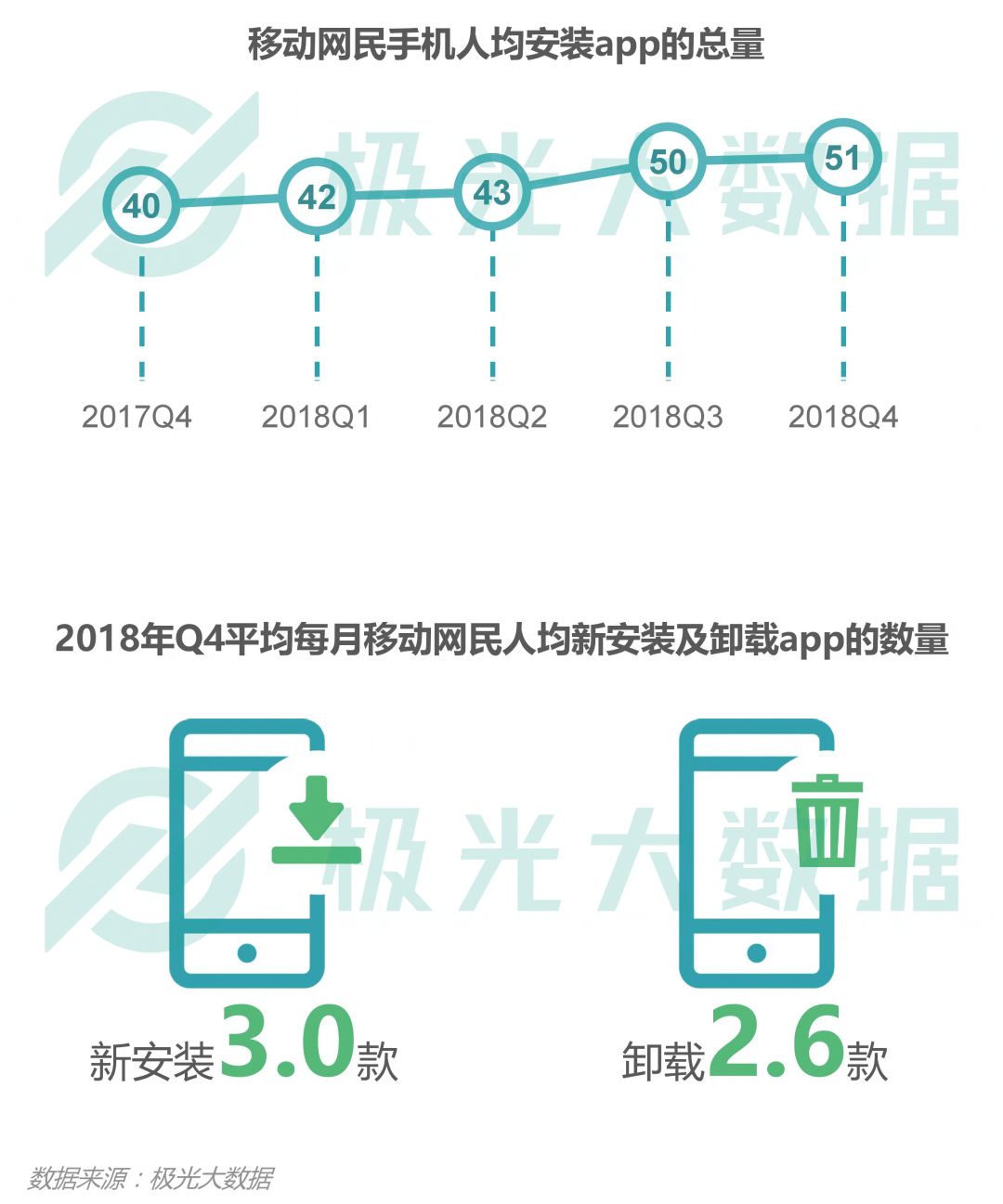 2018年Q4,平均每月中国移动网民人均新装app数量为3款,同期卸载app数量为2.6款