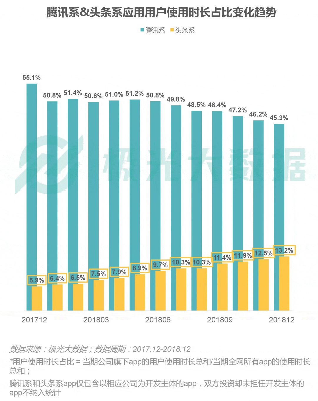 “头腾大战”中,腾讯系用户app使用时长在全网应用中占比持续下降至45.3%;头条系用户使用时长占比显著上升至13.2%
