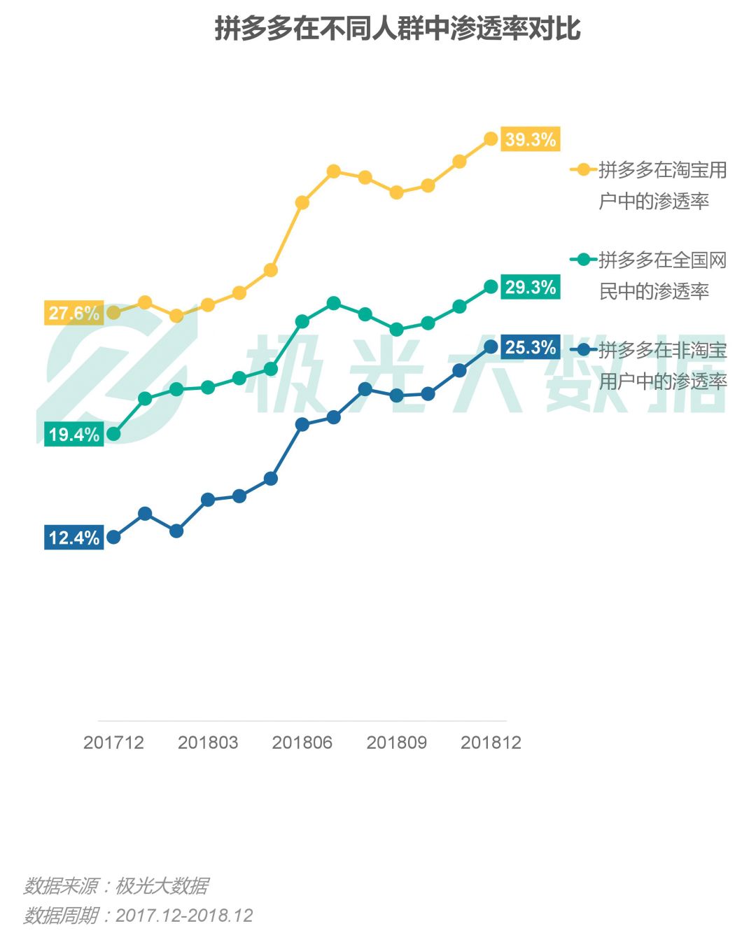 “拼淘之争”中,拼多多在手淘用户中的渗透率迅速攀升至39.3%,渗透趋势明显