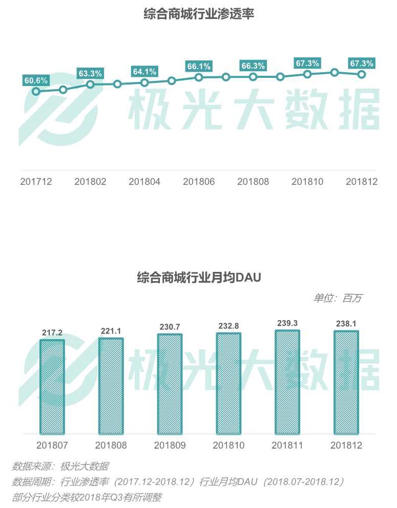 综合商城行业渗透率及月均DAU