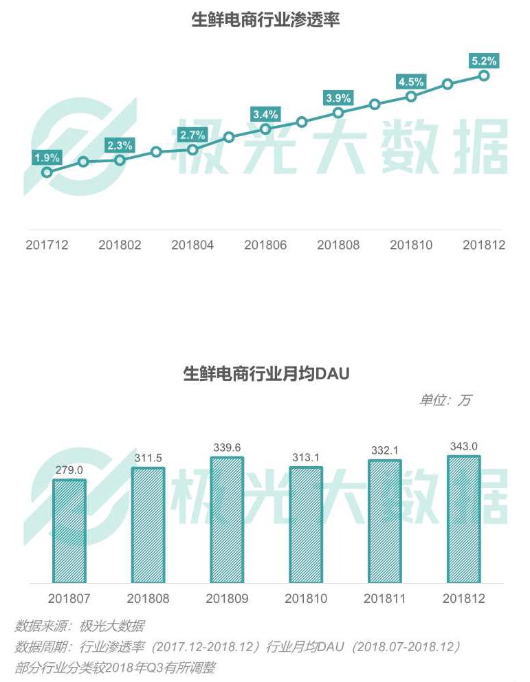 在各电商巨头的带动下,生鲜电商行业渗透率同比增长173.7%,2018年12月渗透率增长至5.2%,行业整体呈现明显的上升趋势。截至2018年12月,生鲜电商行业DAU均值达343万