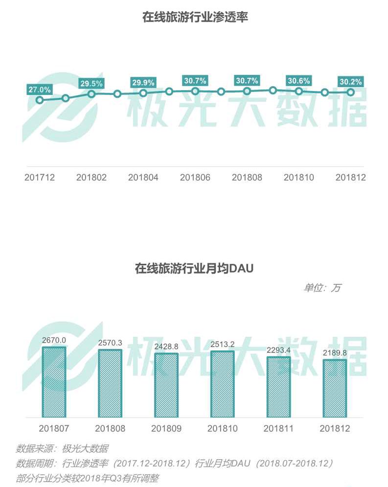在线旅游行业2018年12月渗透率为30.2%,相比去年同期增长了10.6%。12月行业DAU均值2189.8万,与同年7月DAU均值相比有明显下降