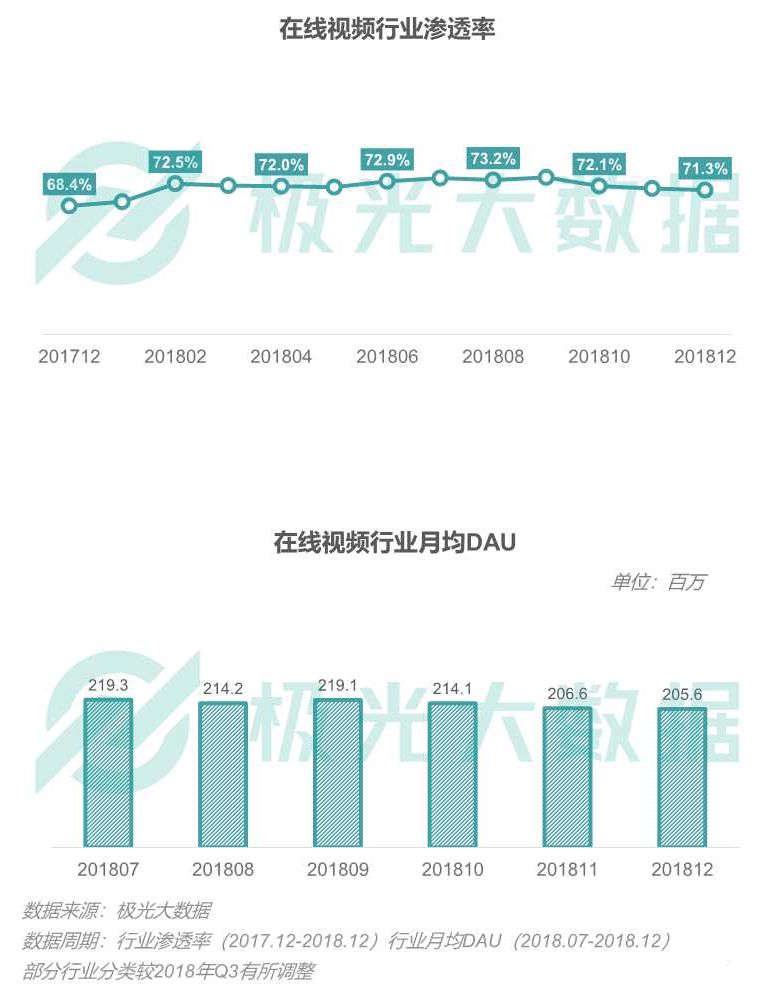 截至2018年12月,在线视频行业渗透率达71.3%,相比去年同期增长4.2%,行业整体呈现波动上涨趋势。12月行业DAU小幅下降至2.06亿