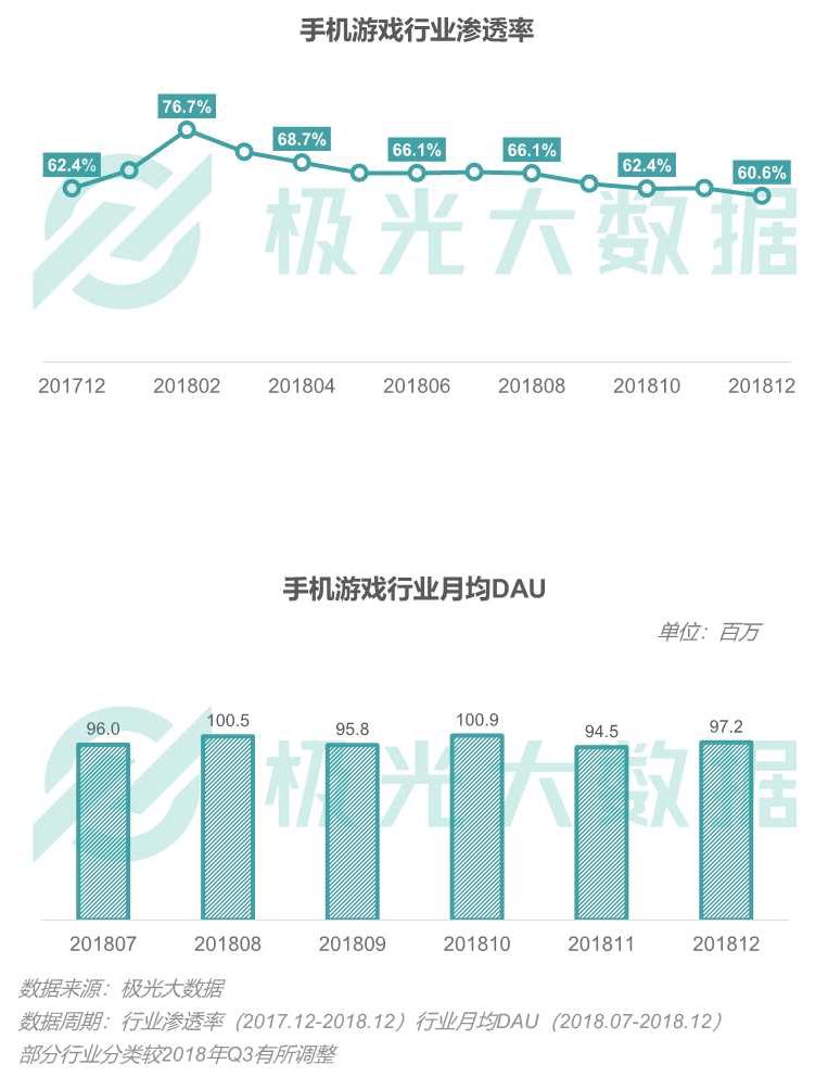 手游行业艰难前进,2018年12月行业渗透率为60.6%,相较全年峰值低21个百分点