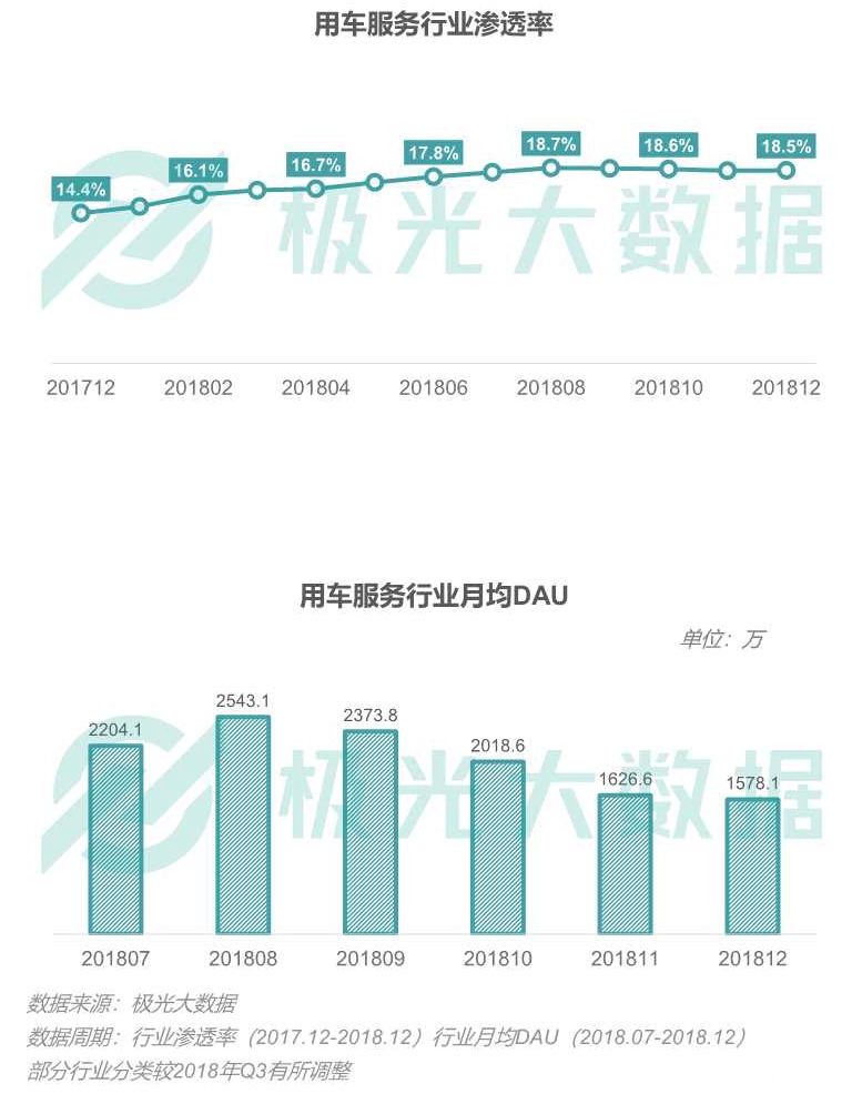 截至2018年12月,用车服务行业渗透率为18.5%,同比增长28.5%。或受近期网约车事件影响,12月DAU均值降至1578.1万